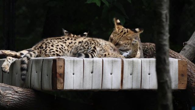 Мама сервал отдыхает на гамаке вместе с котятами и облизывает их 18.07.2025