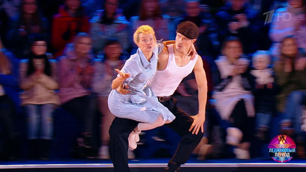 На льду — чемпионка мира и Европы Оксана Домнина и актер театра и кино Кирилл Зайцев. Пара выступает под песню «Диалог у телевизора» в исполнении Владимира Высоцкого.