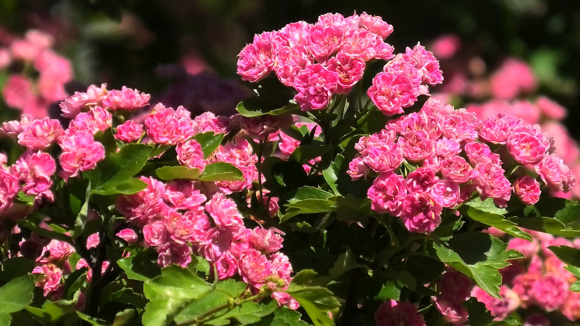 В городском сквере цветёт очень красивый гибридный боярышник.