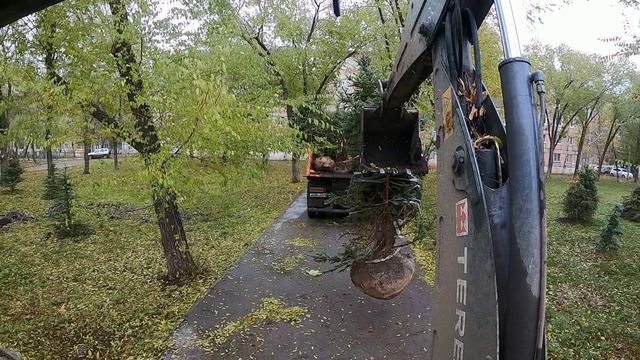 Экскаватор выручает.Сажаем ели с помощью экскаватора.