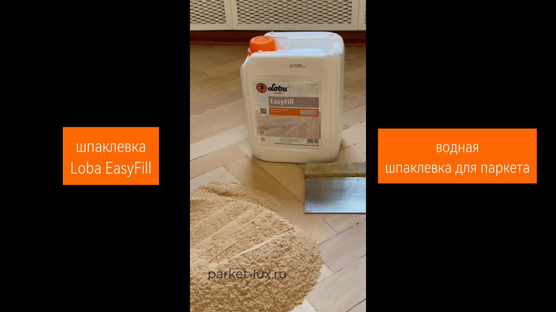 Шпаклевка для паркета на акриловой основе водной дисперсии. Состав смешать с паркетной пылью после шлифовки. Цвет шпаклевки полностью совпадает с паркетом.