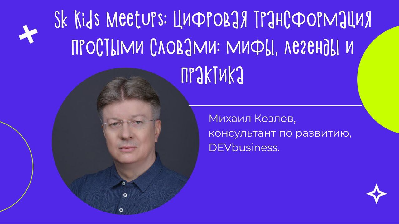 Спикер: Михаил Козлов, консультант по развитию, DEVbusiness. На лекции поговорим о том, что относится и что не относится к цифровой трансформации, для чего она нужна и как ее можно сделать. Во время встречи узнаем: что такое цифровая трансформация; основные этапы; необходимые знания и навыки.
