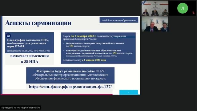 16 ноября 2022 г. в 11-00 (МСК) состоялось совещание в формате ВКС с субъектами Российской Федерации по вопросу практической реализации Федерального закона от 30 апреля 2021 г. № 127-ФЗ «О внесении изменений в Федеральный закон «О физической культуре и спорте в Российской Федерации» и Федеральный закон «Об образовании в Российской Федерации» (далее – Федеральный закон № 127-ФЗ) в части реализации дополнительных образовательных программ спортивной подготовки образовательными организациями системы образования.