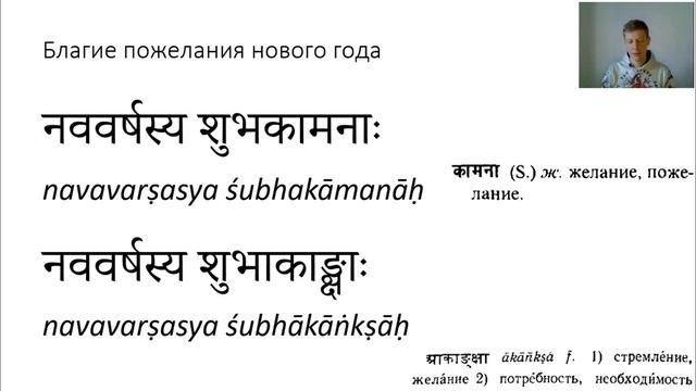 Из этого видео вы узнаете стандартные фразы, использующиеся для поздравления с Новым годом на санскрите: शुभं नववर्षम् śubhaṃ navavarṣam Благой новый год! नववर्षस्य शुभाशयाः navavarṣasya śubhāśayāḥ नववर्षस्य शुभकामनाः navavarṣasya śubhakāmanāḥ नववर्षस्य शुभाकाङ्क्षाः navavarṣasya śubhākāṅkṣāḥ Благие новогодние пожелания! नववर्षाभिनन्दनम् navavarṣābhinandanam Новогоднее приветствие! नूतनवर्षे सर्वकार्यनिर्विघ्नेन परिपूर्णतासिद्धिरस्तु nūtanavarṣe sarvakāryanirvighnena paripūrṇatāsiddhirastu Да свершится в новом году обретение совершенства благодаря беспрепятственности во всех делах!