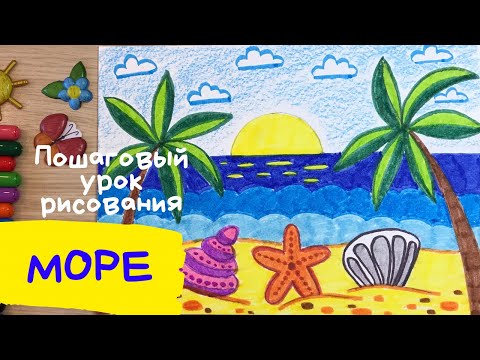 Легкий рисунок моря для детей Как нарисовать лето море солнце пляж пальмы легко Здравствуй лето