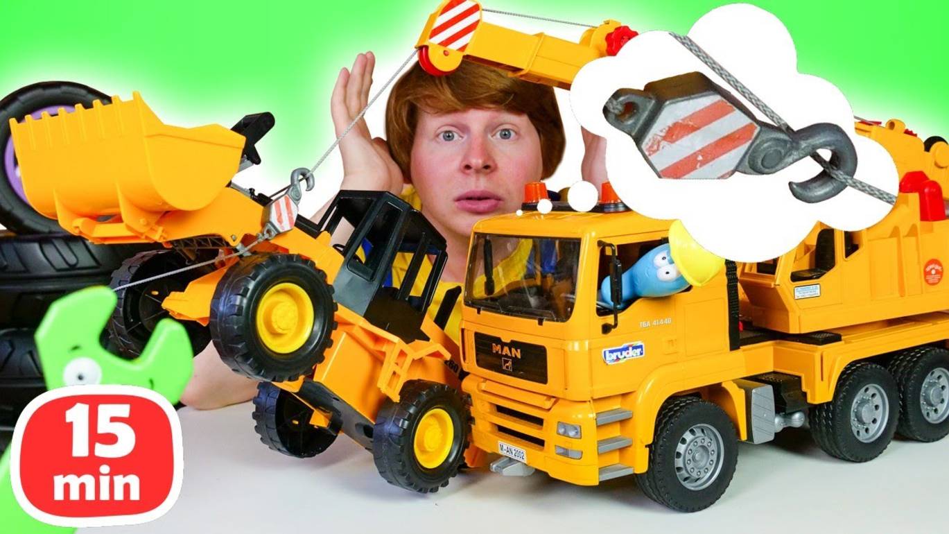 Видео про машинки — Бульдозер и Автокран ЗАПУТАЛИСЬ! Автомастерская для мальчиков