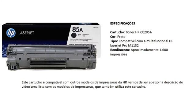 Neste tutorial vamos lhe mostrar qual o cartucho correto, que você deve comprar para sua impressora multifuncional da HP laserjet Pro M1132. Acreditamos que muitas pessoas tem está dúvida, quando o cartucho da impressora esta vazio e precisa fazer a compra ou até mesmo a pessoa compra a impressora usada ela esta sem o cartucho. Lista de outros modelos de impressoras da HP que utiliza o cartucho: CE 285A ou 85A Impressora HP LaserJet Pro P1102W; Impressora HP LaserJet Pro P1102; Impressora Multifuncional HP LaserJet Pro M1130; Impressora Multifuncional HP LaserJet Pro M1132 MFP; Impressora Multifuncional HP LaserJet Pro M1134 MFP; Impressora Multifuncional HP LaserJet Pro M1136 MFP; Impressora Multifuncional HP LaserJet Pro M1137 MFP; Impressora Multifuncional HP LaserJet Pro M1138 MFP; Impressora Multifuncional HP LaserJet Pro M1139 MFP; Impressora Multifuncional HP LaserJet Pro M1210 MFP; Impressora Multifuncional HP LaserJet Pro M1212 MFP; Impressora Multifuncional HP LaserJet Pro M1213 MFP; Impressora Multifuncional HP LaserJet Pro M1214 MFP; Impressora Multifuncional HP LaserJet Pro M1216 MFP; Impressora Multifuncional HP LaserJet Pro M1217nfw MFP; Impressora Multifuncional HP LaserJet Pro M1217W MFP; Impressora Multifuncional HP LaserJet Pro M1219 MFP; Impressora Multifuncional HP LaserJet Pro P1102.