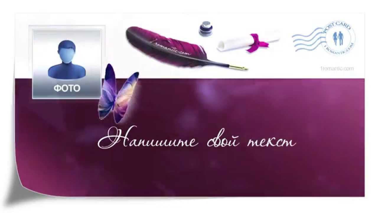 Создайте свою поздравительную открытку, бесплатно в два клика. Поверьте... это очень оригинальный, незабываемый и душевный подарок. Наполните свою открытку нужными словами и приложите свою фотографию. Отправьте её своим дорогим и близким по средства ММС е-mail Skype Viber WhatsApp Bluetooth и т.д. С уважением, Ваш 1romantic.com