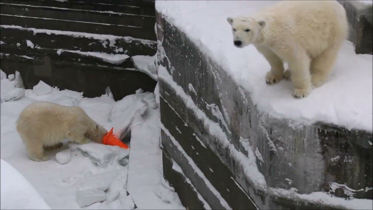 Герда родилась в Москве 20 ноября 2007 года. Её мама Симона, папа Врангель. В Новосибирск переехала 05.08.2008. В 2013 году у Герды и Кая родилась Шилка. В 2015 году она переехала в Японию. В 2015 году родился Ростик. 6 декабря 2018 года он переехал в Китай. В 2018 году родились Норди и Шайна. Сейчас они находятся в нашем зоопарке в закрытой от посетителей хозяйственной зоне. В другие зоопарки их не могут отправить. Сначала была пандемия, сейчас границы закрыты и санкции. Белые медведи Норди и Шайна содержатся в МУП «Новосибирский зоопарк имени Р. А. Шило» с рождения и по настоящее время. Данная пара молодых медведей находится вне экспозиции зоопарка, поэтому посетители не могут их видеть. Передача молодых медведей в другой зоопарк пока не планируется, — ответили на запрос редакции в пресс-центре мэрии Новосибирска. У них есть бассейн, игрушки. Их так же кормят как и раньше. Голодные не бывают. Шайна размером с маму, Норди с папу. Шайна командует Норди. Одиночные животные. Как правило, миролюбивы по отношению друг к другу, но между самцами в брачный период случаются стычки. Взрослые самцы могут нападать на медвежат. Гон с марта по июнь. Продолжительность жизни — максимум 25—30 лет; в неволе рекорд долгожительства — 42 года. Вес очень крупных самцов в некоторых частях ареала 700 и даже 800 кг: есть данные о зверях весом до 1000 кг. Обычно вес меньше. Самки всегда не только меньше, но и значительно легче самцов. Так, самцы в восточной Гренландии в состоянии нормальной упитанности весят 400—450 кг, хорошо упитанные — до 500 кг, самки, даже очень сытые, здесь же редко весят больше 350—380 кг, т. е. их вес составляет около 75% веса самцов. Длина тела на 3-й день после рождения 28—32 см, средний вес — около 755 г (650—840 г). На 26-й день длина тела увеличивается незначительно — до 35—38 см, а вес возрастает до 1125—1275 г. В возрасте 60 дней самцы весят около 7 кг, самки — около 6 кг при длине тела у первых 58—60 см, у вторых 54—58 см. В возрасте 4 месяца медвежата достигают веса 22—23 кг, в 6-месячном возрасте при длине около 110 см — 40—43 кг, в 8-месячном — 58—62 кг. Длина тела в возрасте с 6 до 9 месяцев нарастает по 6—7 см в месяц. Во время зимнего сна рост почти прекращается. В зоопарке медведей кормят утром морской рыбой, хлеб с рыбьим жиром внутри, морковь, яблоки, морская капуста, яйцо дают сырое. Медвежат подкармливают молоком из соски. На ужин мясо (говядина, конина, куры или индейка). Летом и осенью арбузы, дыни, ранетки, кабачки, тыквы, огурцы. Когда показательное кормление летом бросают живую рыбу. Медвежата с медведицей находятся до 2-х лет. 16 декабря 2022 года Герда родила 2-х медвежат. И это две девочки! Имена дали 25 июня. Медвежат зовут Стрелка и Белка. Обзор вольеров белых медведей https://www.youtube.com/watch?v=mAt_b7JD0B4&list=PLGvf0V-rAHxkpGKJaWIZIUxRKgKiqV3xZ&index=17&t=0s