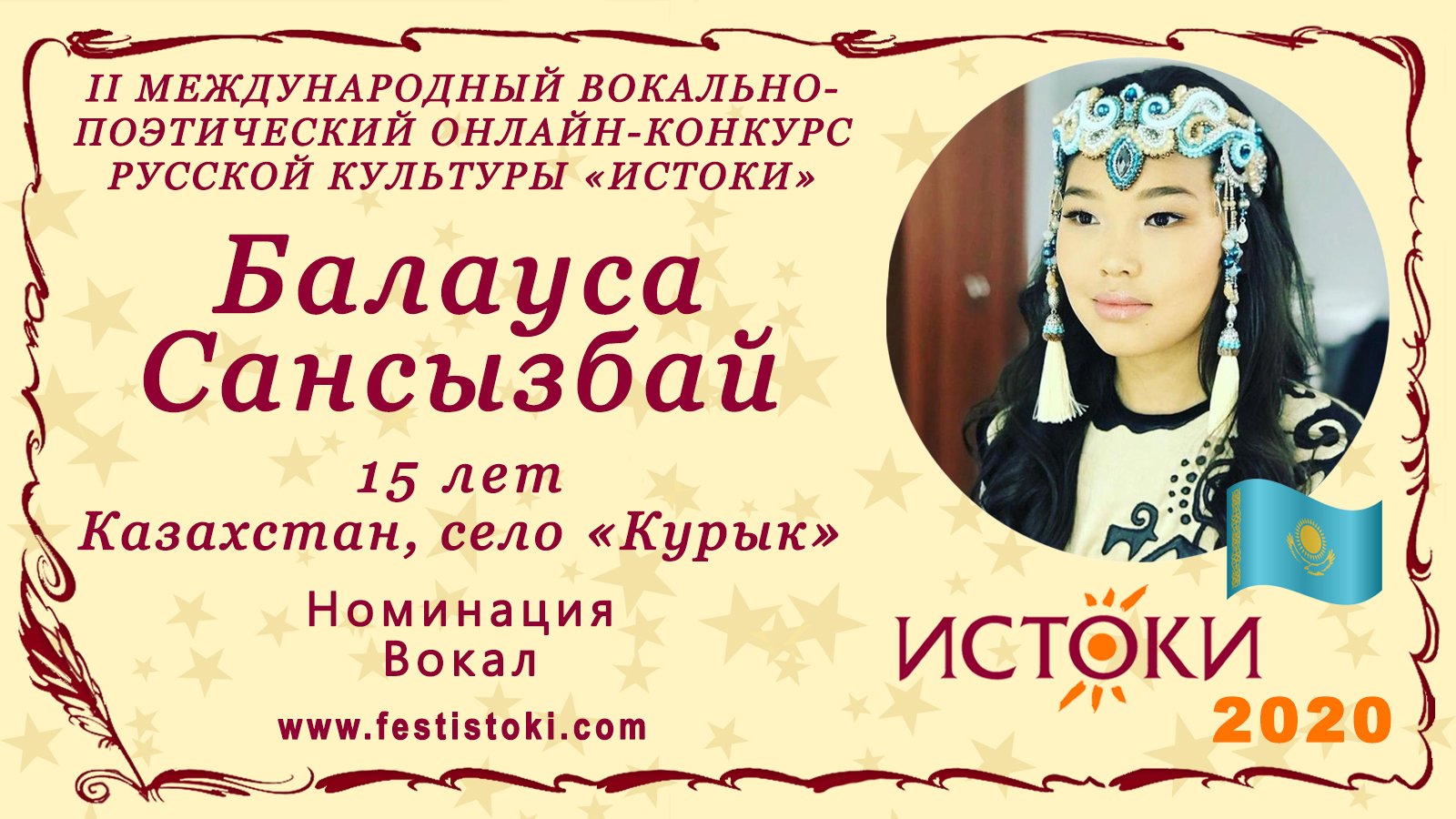 Лауреат I степени II Международного вокально-поэтического онлайн-конкурса русской культуры «Истоки». Номинация - Вокал. Народная песня "Реченька" в обработке А.Пугачевой. Сайт: www.festistoki.ru / www.festistoki.com E-mail: festistoki@mail.ru