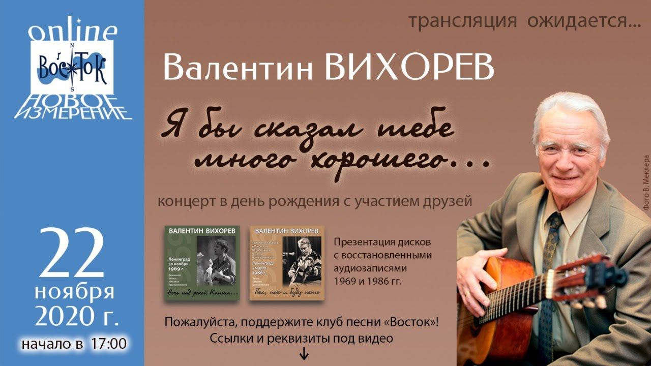 Первый онлайн-концерт – «Я бы сказал тебе много хорошего...» – состоялся 22 ноября 2020 г. в 17:00. Вы встретились с классиком жанра, замечательным автором, одним из основателей клуба песни «Восток» Валентином Ивановичем Вихоревым, который в этот день будет отмечать свой 89-й день рождения! «Восток» – организация некоммерческая. В это непростое время клуб продолжает работу для вас! И мы, как никогда, нуждаемся в вашей поддержке. На всех концертах и в любое другое время будет действовать система «donation» (пожертвования в любом размере). Средства на деятельность клуба можно перечислять на банковские карты: Сбербанк 2202200538677905 Тинькофф: 5536913857452672 Карты привязаны к тел. Т. А. Зориной +79643424860. Также средства можно переводить на Яндекс-кошелёк: https://yoomoney.ru/to/41001681539469. Давайте оставаться на связи, петь и слушать хорошие песни и поддерживать друг друга в это необычное и неуютное время!