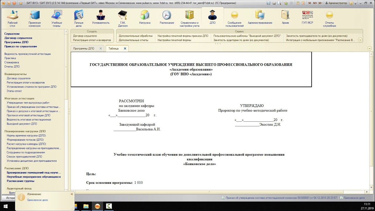 О решении БИТ.ВУЗ 1. Место БИТ.ВУЗ в информационной системе вуза; 2. Краткое описание функционала всех блоков БИТ.ВУЗ; 3. Опыт внедрения БИТ.ВУЗ и модуля «БИТ.Дополнительное профессиональное образование» (далее БИТ.ДПО). Организация работы института ДПО на базе решения БИТ.ДПО Учет программ обучения слушателей: 1. роль программы в учете; 2. учебный план. Учет слушателей: 1. формирование личных данных слушателей, приказов по движению контингента, формирование отчетности; 2. отчетность по слушателям (включая 1-ПК). Ведение взаиморасчетов со слушателями: 1. ведение договоров слушателей (как индивидуальных, так и групповых, с физическим или с юридическим лицом); 2. интеграция с «БИТ.Расчеты со студентами по договорам и оплатам»; 3. контроль финансовой задолженности слушателей; 4. отчетность по выполнению финансовых обязательств слушателя перед Университетом. Ведение учета успеваемости слушателей: 1. формирование ведомостей по сдаваемым дисциплинам; 2. учет итоговой аттестации; 3. формирование и выдача выходных документов (удостоверений, дипломов и т.д.) по итогам прохождения программ. Планирование и учет нагрузки преподавателей, расписание: 1. планирование нагрузки; 2. составление расписания; 3. учет фактической нагрузки; 4. отчетность.