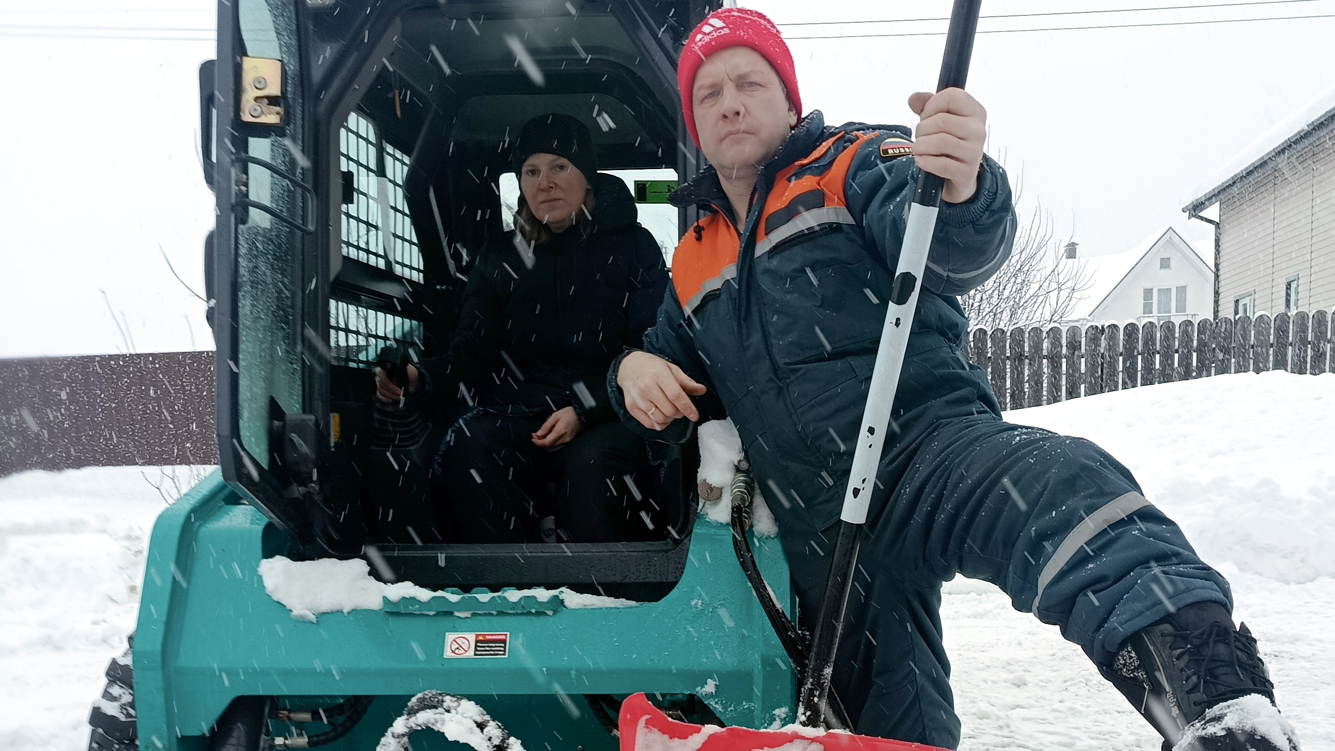 супруга учит меня чистить снег на минипогрузчике.