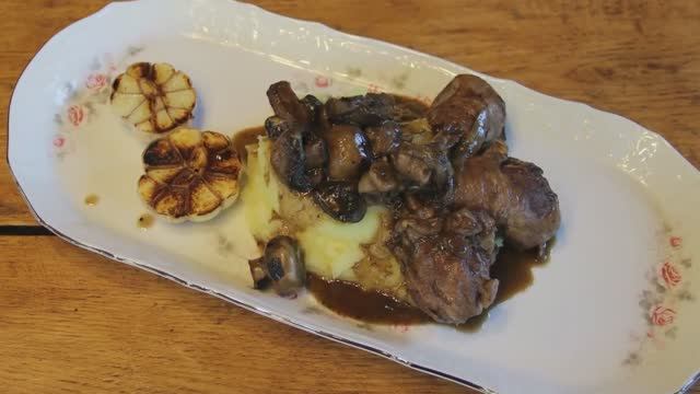 Курица тушеная в красном вине с грибами и пряностями.