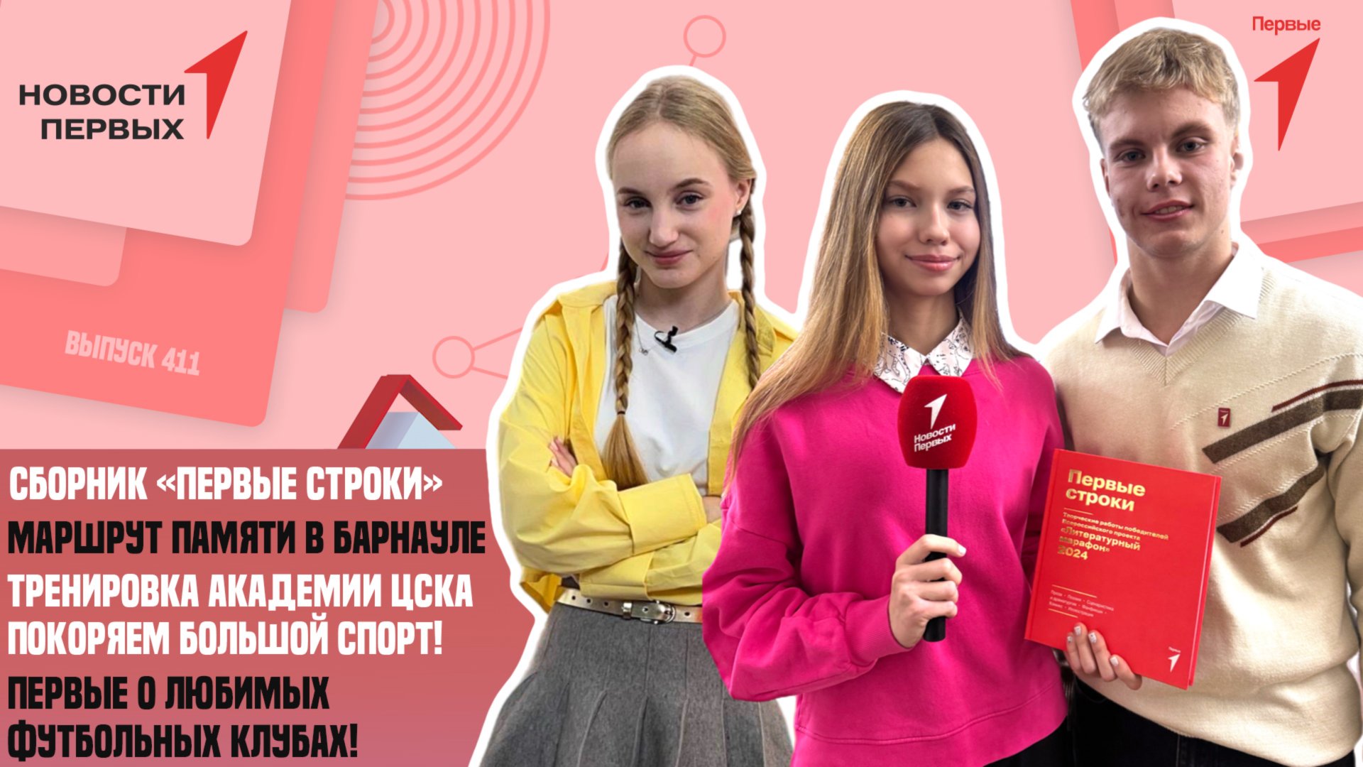 Сегодня в выпуске «Новостей Первых» покажем: • презентацию книги «Первые строки» — сборника творческих работ победителей «Литературного марафона»; • тренировку Академии ЦСКА; • рассказ Первых о любимых футбольных клубах; • маршрут памяти в Барнауле.