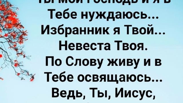 ХРИСТИАНСКИЕ ПЕСНИ ДЛЯ ХВАЛЫ И ПОКЛОНЕНИЯ ПРОСЛАВЛЕНИЯ ВООДУШЕВЛЕНИЯ ЕВАНГЕЛИЗАЦИИ #господь#музыка#христианская_музыка#музика#христианскиепесни#бог#христианскиестихи#любовь#христианство#стихи#песня#песни#иисус#иисусхристос#иисусмойбог#иисус_христос#иисусбог#иисусгосподь#хвалы_и_поклонения#хваление#хвала#прославление https://stihi.ru/avtor/zhanna70 Стихи Жанна Юрьевна Волкова-Варламова https://stihi.ru/2024/11/01/6310 О, мой Господь, какой же Ты прекрасный... Как я хочу походить на Тебя, Иисус. Ведь, Ты во всём, и, Ты - Всевластный... Смотрю я на Тебя, и, у Тебя учусь. Припев: Без Тебя я никто...Ничего не умею... Мудрости дай мне свыше, Господь. Семя Благое на Земле я посею... Плоды Тебе Оно принесёт. А..а...а..а...а..а...а М...м..м..м..м Ты - Всё во всём, Господь...Ты - Альфа и Омега... Всё началось с Тебя и всё - в Тебе одном. Создал Ты, Бог, для Себя человека... Чтобы стал он Небесным Послом. Припев: Без Тебя я никто...Ничего не умею... Мудрости дай мне свыше, Господь. Семя Благое на Земле я посею... Плоды Тебе Оно принесёт. А..а...а..а...а..а...а М...м..м..м..м Ты мой Господь и я в Тебе нуждаюсь... Избранник я Твой... Невеста Твоя. По Слову живу, и, в Тебе освящаюсь... Ведь, Ты, Иисус, Любовь моя. Припев: Без Тебя я никто...Ничего не умею... Мудрости дай мне свыше, Господь. Семя Благое на Земле я посею... Плоды Тебе Оно принесёт. А..а...а..а...а..а...а М...м..м..м..м Ты мой Господь и я в Тебе нуждаюсь... Избранник я Твой... Невеста Твоя. По Слову живу, и, в Тебе освящаюсь... Ведь, Ты, Иисус, Любовь моя. Припев: Без Тебя я никто...Ничего не умею... Мудрости дай мне свыше, Господь. Семя Благое на Земле я посею... Плоды Тебе Оно принесёт. 01.11.32024 Жанна Волкова-Варламова ____________________________________________