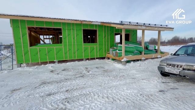 Вы можете видеть зелёную плёнку влаговетровой защиты, зафиксированную контррейками. Такая плёнка не только защищает утеплитель от попадания на него влаги, но и значительно упрощает его укладку. После того как весь утеплитель будет установлен между стойками каркаса стен, мы закроем его листом пароизоляции с помощью всё тех же контрреек. Далее останется только выполнить внешнюю и внутреннюю обшивку стен.