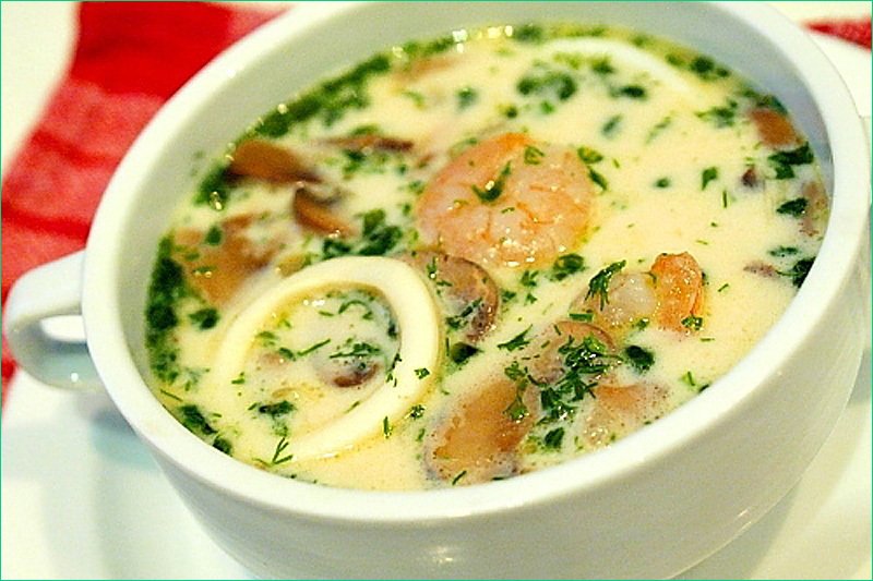 СУП ИЗ МОРСКОГО КОКТЕЙЛЯ С МОРЕПРОДУКТАМИ ИНГРЕДИЕНТЫ: Морской коктейль 800 г. Лук репчатый 1 шт. Морковь 3 шт. Картофель 8-10 шт. Приправа для рыбы 1 чайная ложка Кокосовое молоко 500 мл Соль Перец чёрный молотый Зелень (укроп, зелёный лук) Вода 2 литра