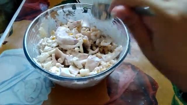 Рецепт: Кальмар, варить в кипящей воде 2 минуты, иначе резиновый будет. Лук репчатый Консервированная кукуруза, читайте состав, можно найти кукурузу без сахара в составе. Майонез( можно сметану, йогурт, или системный майонез по системе минус 60 : примерно 2 ст.л. йогурта без сахара белого и 1 ч.л. соевого соуса, тоже читайте состав, лучше соевый соус без глютена