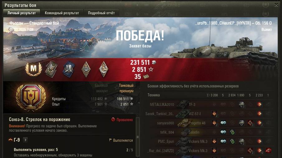 ФЬОРДЫ МАСТЕР на Об. 156 0 ОПЫТ: 1728 СУММАРНЫЙ УРОН: 8275