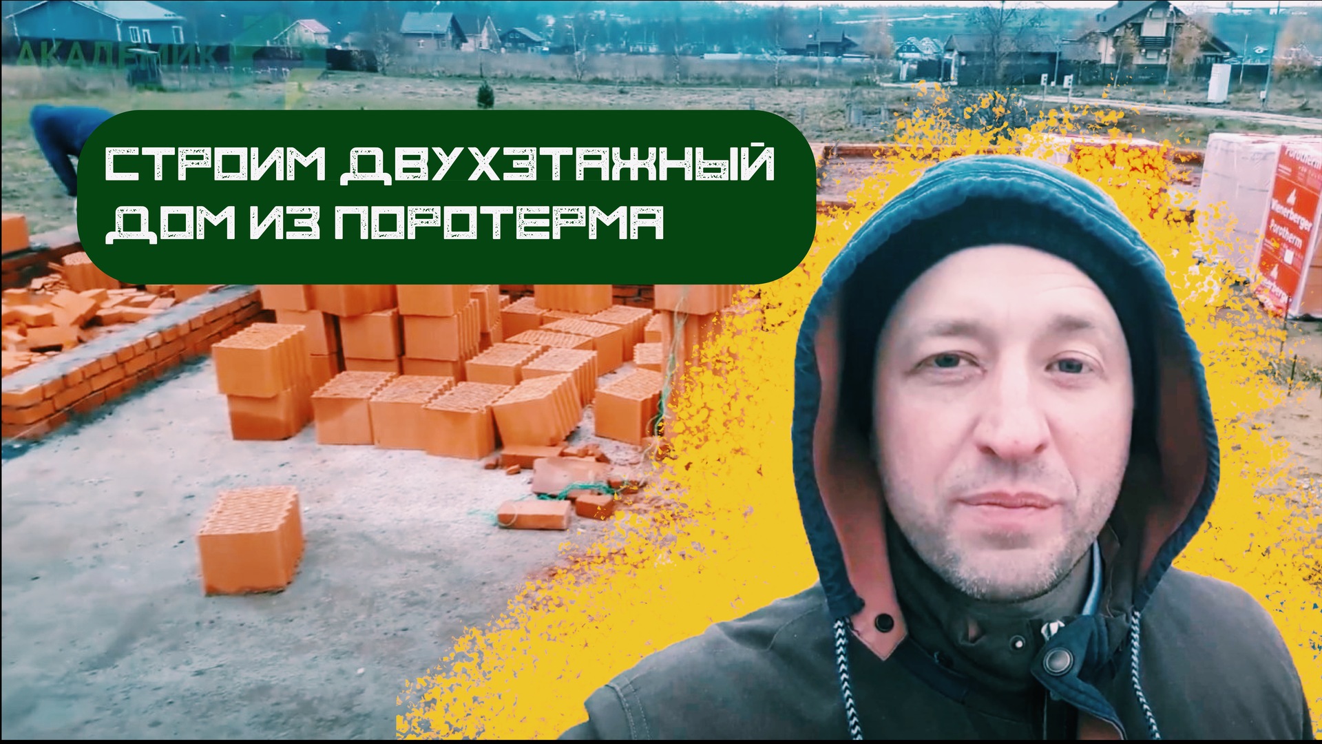 Видео-обзор с места строительства двухэтажного дома и отдельно стоящего гаража из поротерма