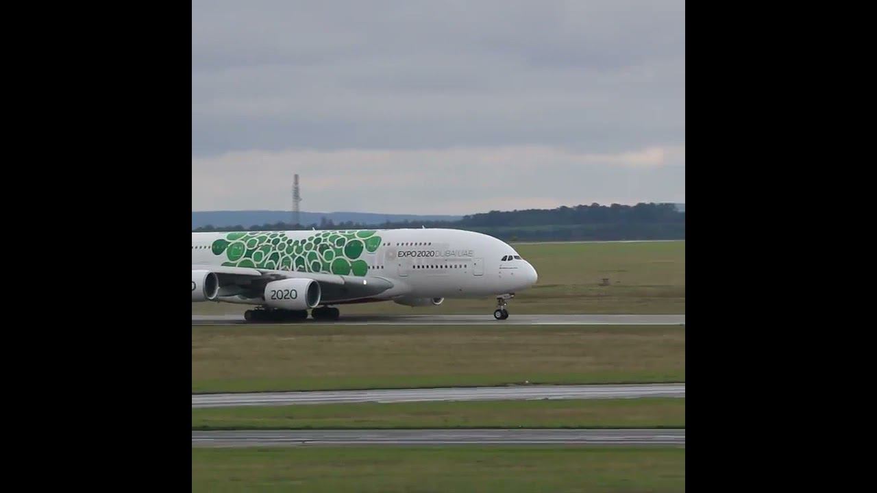 Взлёт из Праги огромного самолёта Airbus A380