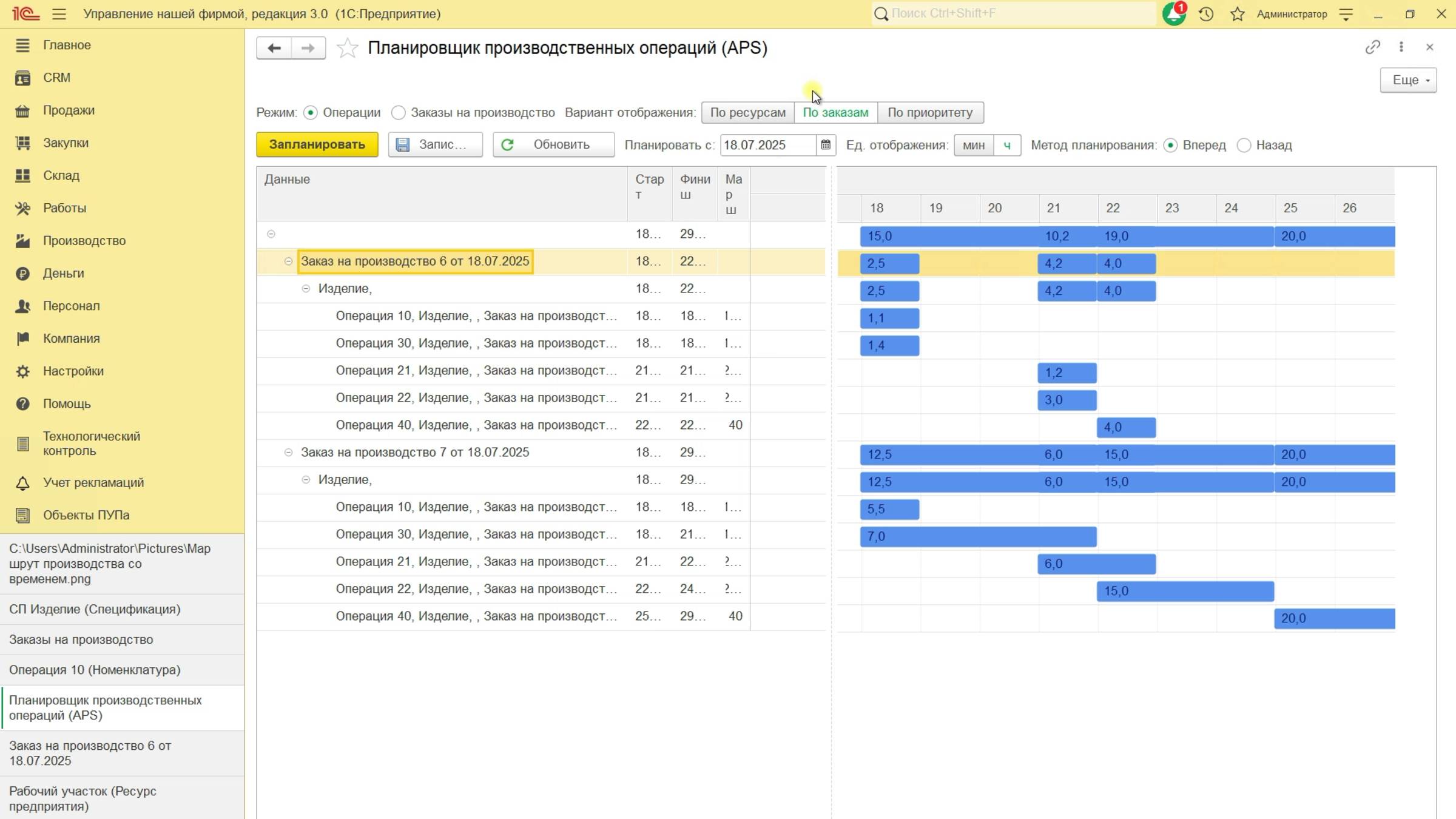 Планировщик производственных операций в 1С УНФ ПУП APS