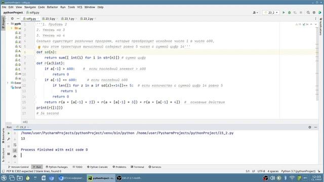 (№ 5542) (М. Шагитов) Исполнитель преобразует число, записанное на экране. У исполнителя есть три команды, которым присвоены номера: 1. Прибавь 2 2. Умножь на 3 3. Умножь на 4 Выполняя первую из них, исполнитель увеличивает число на экране на 2, выполняя вторую – умножает на 3, выполняя третью – умножает на 4. Программой для исполнителя называется последовательность команд. Сколько существует различных программ, которые преобразуют исходное число 1 в число 600, и при этом траектория вычислений содержит ровно 5 чисел с суммой цифр 14 ссылку на исходник не нашел. сорян. https://www.youtube.com/@NikolayUchitel/community