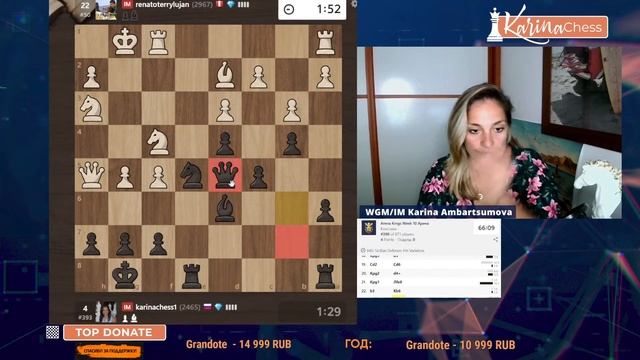 2х часовая арена по 3 минуты. Поддержать канал: https://www.donationalerts.com/r/karinachess1 Подписаться на мой канал: https://www.youtube.com/channel/UChor8u_hhgrjX2lt0QLzZHA?sub_confirmation=1 Рестрим: https://www.twitch.tv/karinachess1 Рада приветствовать Вас на канале женского международного гроссмейстера, международного мастера Карины Амбарцумовой! Я - профессиональная шахматистка и тренер. Здесь вы сможете найти обучающие видеоуроки по шахматам, комментарии турниров, стримы моей игры в блиц шахматы. Подписывайтесь на мои странички в соц.сетях: ВКонтакте: https://vk.com/karinachessclub Twitch: https://www.twitch.tv/karinachess1 Почта для связи: karinachess@mail.ru Поддержать канал: https://www.donationalerts.com/r/karinachess1 Мой сайт: http://chesscoach.ru/