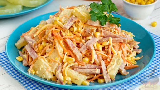 Ингредиенты, входящие в состав этого сочного и яркого салата, уже готовы к употреблению, поэтому на приготовление чудо-закуски уйдёт 10 минут. Салат получается пикантным и имеет интересный пряно-сладкий вкусовой оттенок. #СалатсАнанасами #СалатсКукурузой #СалатсВетчиной #СалатсСыром #СалатсКорейскойМорковью