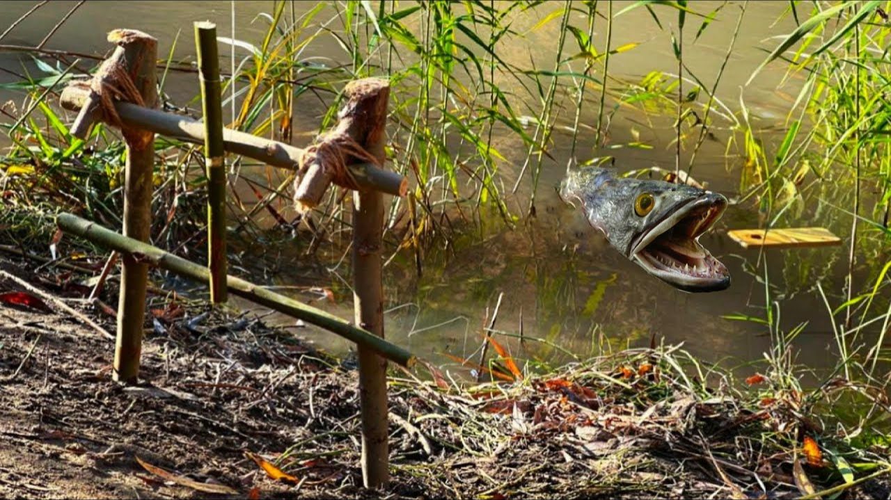 Техника рыбной ловли , с помощью спускового механизма / Необычный способ ловли рыбы !