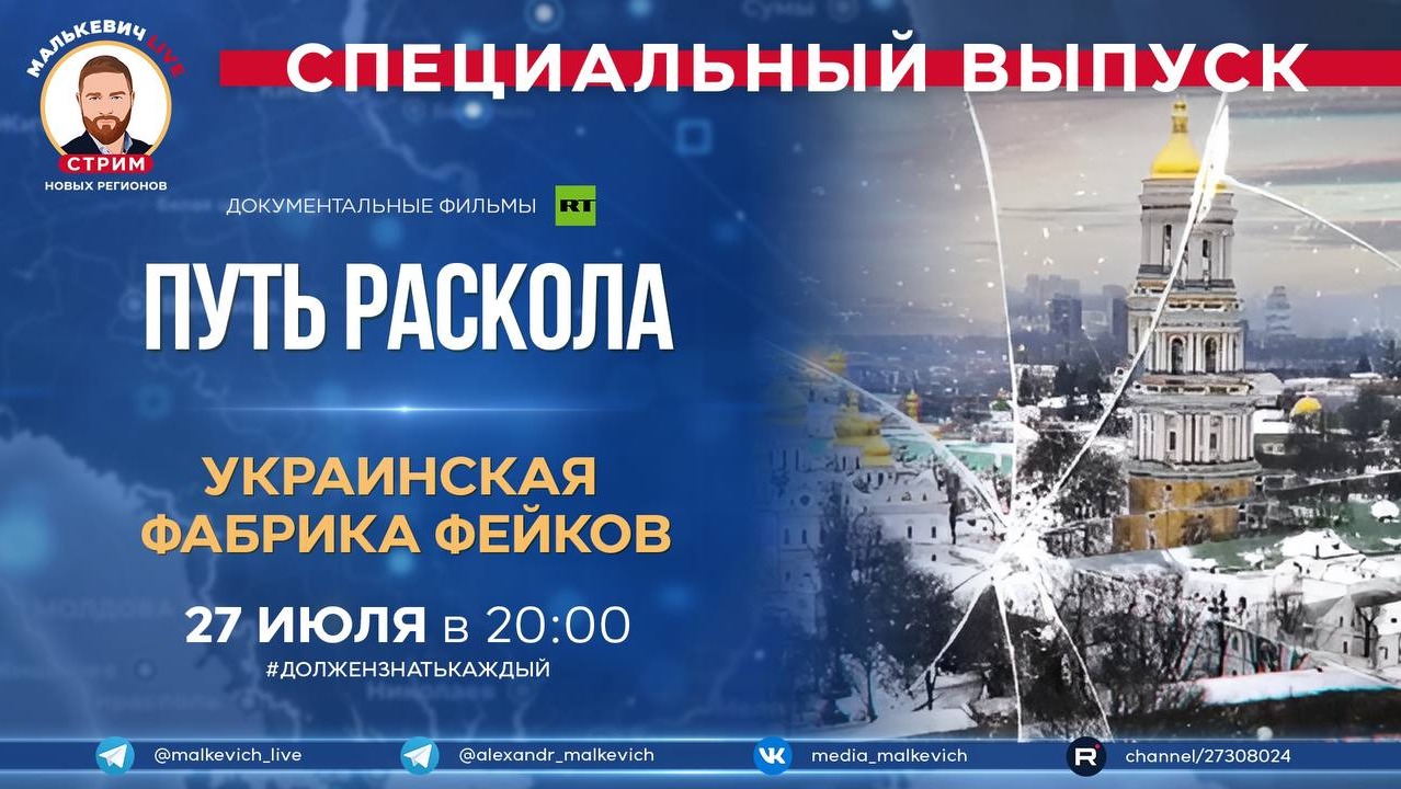 В рамках спецрубрики #ДолженЗнатьКаждый мы покажем два фильма документального телеканала RTД. (https://t.me/rtdru) ▪️ Документальный фильм «Путь раскола». Атаки на православную церковь и репрессии против священнослужителей на Украине велись на протяжении нескольких столетий. С новой силой они вспыхнули в 2014 году, после «майдана»: процесс отделения украинской церкви от РПЦ сопровождался массовыми захватами храмов и монастырей. Сотни священников и верующих были вынуждены бежать из страны, а те, кто остался, живут в атмосфере, пронизанной страхом, в ожидании ареста и конфискации церковного имущества. Авторы фильма побывали в православных храмах, где, несмотря на разрушения, ведутся службы, встретились со священнослужителями и экспертами. Журналисты, религиоведы, историки объяснили, почему церковь, подчиняющаяся московскому патриарху, объявлена враждебной и подлежащей уничтожению и кому выгодна идея использовать религиозный фактор для отделения Украины от России. ▪️ Документальный фильм «Украинская фабрика фейков». Украинский конвейер фейков работает на полную мощность: в соцсетях уже тысячи лживых сообщений о спецоперации Вооружённых Сил РФ, применяются новейшие способы воздействия на людей. Как организована эта информационная война и что делают в России, чтобы ей противостоять? В репортаже рассказывается, кто и по каким методикам разрабатывает и распространяет по всему миру подложные фото и видео, связанные с нынешними событиями на Украине. На примере конкретных фейков вы увидите, как их делают, что ставится во главу угла для российской, западной аудитории, а также для домашнего, внутриукраинского употребления. Эксперты объясняют технологию работы этого «конвейера» и предлагают способы борьбы с ним. Документальные фильмы «Путь раскола» и «Украинская фабрика фейков» ? Внимательного вам просмотра @malkevich_live