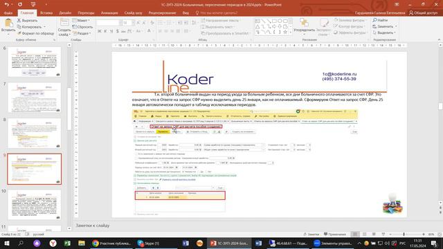 Компания «Кодерлайн» провела вебинар «1С:ЗУП 2024. Больничные, пересечение периодов» Ведущая: Гардышева Галина - консультант-аналитик 1С:ERP Целевая аудитория для бухгалтеров, пользователей и специалистов ИТ-подразделений компаний различных отраслей. Описание С началом 2024 года, после введенных законодательных корректировок, работа с социальными пособиями изменилась. Как теперь работать с ЭЛН, с прямыми выплатами? На примере 1С:ЗУП проверим, какие настройки, алгоритмы и новые сервисы появились в конфигурации. Программа 1. Отражение двух периодов начислений и удержаний; 2. Изменения в расчете пособий; 3. Отражение больничного для договорников ГПХ; 4. Больничный по уходу за ребенком; 5. Дополнительные сервисы, отчеты.