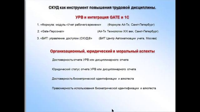 Вебинар предназначен, для специалистов — инсталляторов СКУД, проектировщиков, а также руководителей и представителей служб эксплуатации СКУД учреждений и объектов. Вопросы трудовой дисциплины были актуальны всегда. Может ли помочь СКУД в этом вопросе? Должна ли СКУД брать на себя воспитательные функции, и какие «подводные камни» есть на этом пути? Этим и иным техническим вопросам посвящен данный вебинар. 1. Типовые примеры и методика использования СКУД как инструмента трудовой дисциплины. Опыт бренда Gate и партнеров инсталляторов. 2. Базовые принципы и варианты организации проходной с алкотестированием. 3. Технические особенности и специфика использования алкометров Алкобарьер и Алкорамка в составе СКУД Gate и Gate-IP-Web. 4. Типовое решение организации точки доступа с алкотестированием на базе СКУД Gate и прибора Алкобарьер: состав, схема подключения, спецификация для заказа.