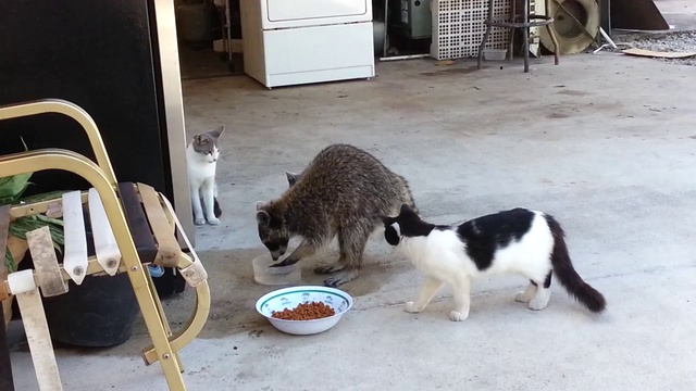 Енот ворует еду у котят