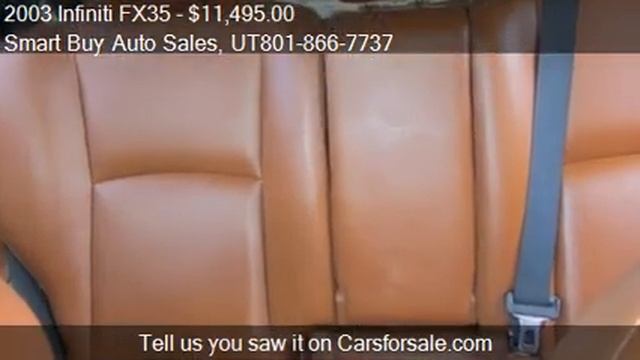 Smart Buy Auto Sales 3268 Washington Blvd in Ogden, UT 84401 Come test drive this 2003 Infiniti FX35 FX35 AWD for sale in Ogden, UT. http://www.buysmartbuy.com The electronic components on this vehicle are in working order. There are no defects present on this vehicle. There are no dings on this vehicle. The engine is mechanically sound and can be driven anywhere with confidence. Extra clean exterior. The interior is in fantastic condition. The odometer reflects accurate mileage. The transmission shifts like it was new. Option List:4WD/AWD,ABS Brakes,Air Conditioning,Alloy Wheels,AM/FM Radio,Anti-Brake System: 4-Wheel ABS,Body Style: SPORT UTILITY 4-DR,Cargo Volume: 27.40 cu.ft.,Cassette Player,CD Changer,CD Player,Child Safety Door Locks,Cruise Control,Curb Weight-automatic: 4204 lbs,Deep Tinted Glass,Driver Airbag,Driver Multi-Adjustable Power Seat,Electronic Brake Assistance,Engine Type: 3.5L V6 DOHC 24V,Fog Lights,Front Brake Type: Disc,Front Headroom: 40.80 in.,Front Hip Room: 54.30 in.,Front Legroom: 43.90 in.,Front Shoulder Room: 56.90 in.,Front Side Airbag,Front Spring Type: Coil,Front Suspension: Ind,Fuel Economy-city: 16 miles/gallon,Fuel Economy-highway: 22 miles/gallon,Ground Clearance: 7.60 in.,High Intensity Discharge Headlights,Interval Wipers,Keyless Entry,Leather Steering Wheel,Maximum GVWR: 5351 lbs,Maximum Payload: 1147 lbs,Maximum Towing: 3500 lbs,Overall Height: 65.00 in.,Overall Length: 189.10 in.,Overall Width: 75.80 in.,Passenger Airbag,Passenger Multi-Adjustable Power Seat,Passenger Volume: 105.10 cu.ft.,Power Adjustable Exterior Mirror,Power Door Locks,Power Windows,Rear Brake Type: Disc,Rear Headroom: 39.50 in.,Rear Hip Room: 55.00 in.,Rear Legroom: 35.20 in.,Rear Shoulder Room: 57.40 in.,Rear Spoiler,Rear Spring Type: Coil,Rear Suspension: Ind,Rear Window Defogger,Rear Wiper,Separate Driver/Front Passenger Climate Controls,Side Head Curtain Airbag,Standard GVWR: 5351 lbs,Standard Payload: 1147 lbs,Standard Seating: 5,Standard Towing: 3500 lbs,Steering Type: RandP,Steering Wheel Mounted Controls,Tachometer,Tank: 23.80 gallon,Telescopic Steering Column,Tilt Steering,Tilt Steering Column,Tires: 265/60R18,Track Front: 62.70 in.,Track Rear: 64.60 in.,Traction Control,Trunk Anti-Trap Device,Turning Diameter: 38.70 in.,Vehicle Anti-Theft,Vehicle Stability Control System,Wheelbase: 112.20 in.,4 Door,All Wheel Drive,Automatic Transmission,Center Console,DVD Player,Leather Seats,Navigation System,Sun/Moon Roof Provided by Carsforsale.com http://video.carsforsale.com/vehiclevideo.aspx?vid=198214226