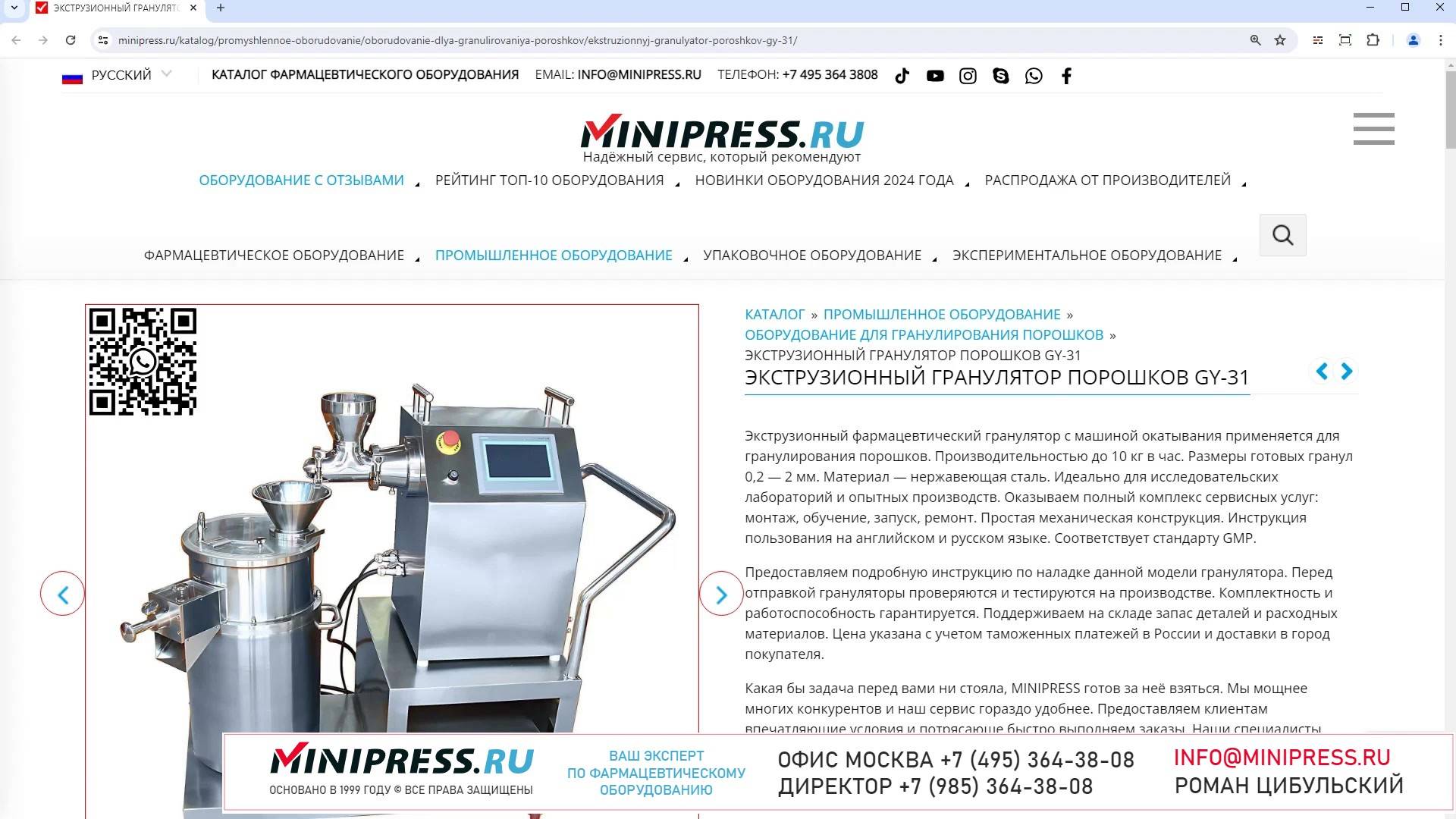 Каталог компании MINIPRESS.RU предлагает большой выбор оборудования ДЛЯ ПЕЧАТИ НА УПАКОВКЕ срока годности и даты производства. Консультируем по выбору Датеров, Кодинг Машин, Нумераторов. В нашем ассортименте машины для печати логотипов на стеклянных ампулах, картонных коробках, желатиновых капсулах Компания Романа Цибульского MINIPRESS.RU занимается поставкой большого ассортимента фармацевтического оборудования из Китая, Кореи, Индии, Европы и других стран. Мы выполняем работы по поиску, подбору, закупке, доставке, и таможенной очистке оборудования с доставкой в любой город России и стран СНГ. Основатель и ведущий специалист компании - Роман Цибульский. Компания MINIPRESS.RU (зарегистрированный товарный знак) основана в 2000 году. Онлайн каталог оборудования MINIPRESS.RU ежедневно посещают несколько тысяч человек. Мы развиваем крупные каналы в социальных сетях, посвященные тематике фармацевтического оборудования. Вы можете посмотреть видео ролики об оборудовании, которым мы занимаемся. Фактически у нас самый большой в России многоязычный каталог фармацевтического оборудования с фотографиями, описаниями, и что более важно с ценами и видео демонстрацией оборудования в работе. Подбор оборудования и консультации ведет сам владелец компании - Роман Цибульский. Компания имеет огромный опыт в работе с различным оборудованием, технологиями. Помогаем клиентам выбрать модель фармацевтического оборудования, которое сможет решить поставленную задачу. Наши специалисты помогают рекомендациями в решении проблем по эксплуатации оборудования. Наша компания имеет офис в г.Шанхай и несколько менеджеров, которые помогают в работе с китайскими поставщиками. Мы долго сотрудничаем и дружим с этими специалистами. Китайские поставщики ценят нас как постоянных партнеров. Роман Цибульский Директор компании Минипресс Поставка фармацевтического оборудования в Россию Пишите: info@minipress.ru Gmail: boss.minipress@gmail.com Офис в Москве +7(495)364-38-08 Мобильный +7(985)364-38-08 (WhatsApp) Каталог оборудования https://www.Minipress.ru/katalog/ МИНИПРЕСС.РУ В СОЦИАЛЬНЫХ СЕТЯХ FB https://facebook.com/roman.tsibulsky YOUTUBE https://www.youtube.com/@farmacevticheskoe_oborudovanie INSTAGRAM https://www.instagram.com/farmacevticheskoe_oborudovanie/ #эмульсия #обеспыливатель #технологии #каталог #состав #менеджмент #смеситель #покупка #финансы #пробка
