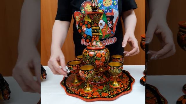 Хохломской набор для вина https://www.artshop-rus.com/suveniry/russkie-suveniry/khokhloma/nabor-khokhloma Авторский набор для сервировки стола. Каждый предмет сделан из дерева. Роспись традиционная хохломская - черный фон и яркий ягодный орнамент. Поверхность покрыта пищевым лаком. Комплект универсальный, в нем можно подавать разные виды напитков. Емкости идеально подойдут для ликера или водки.