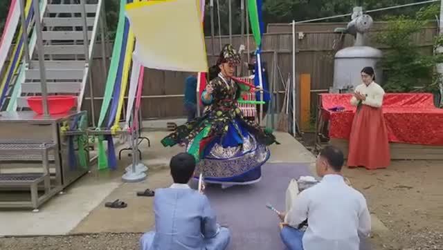 Корейский шаман(мудан) Чхонгун-дорён исполняет ритуальный танец в образе Генерала Бису