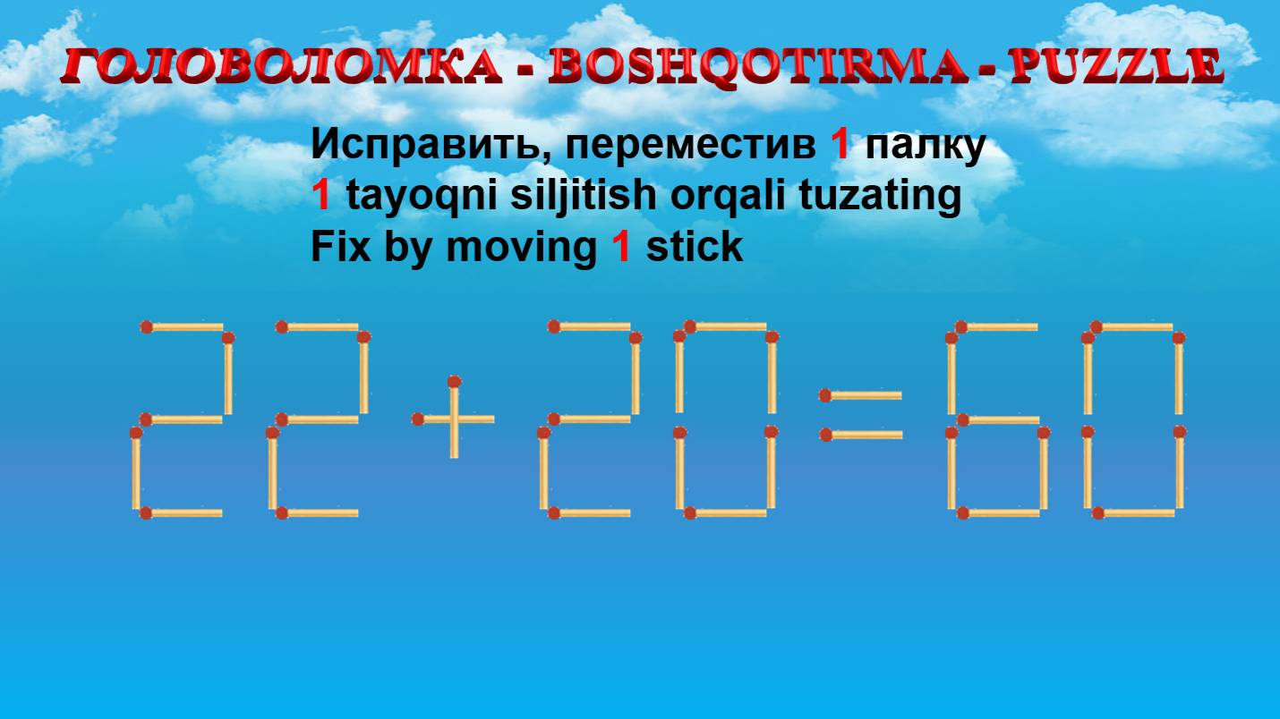 ГОЛОВОЛОМКА - BOSHQOTIRMA – PUZZLE. Спичка. 22+20=60, 28+36=52, 25+68=95, 23+23=62 Telegram: https://t.me/RUTUBEMATEMATIK