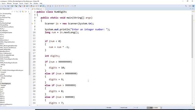 Write a program that reads an integer and prints how many digits the number has, by checking whether the number is ≥ 10, ≥ 100, and so on. (Assume that all integers are less than ten billion.) If the number is negative, first multiply it with –1.