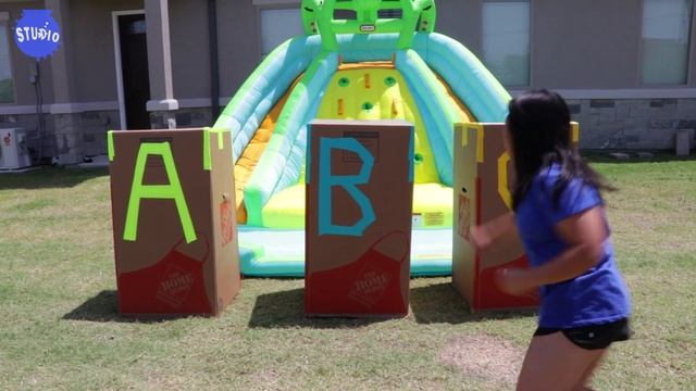 DONT Push the Wrong MYSTERY BOX into the Water of Giant Inflatable Water Slide!!!