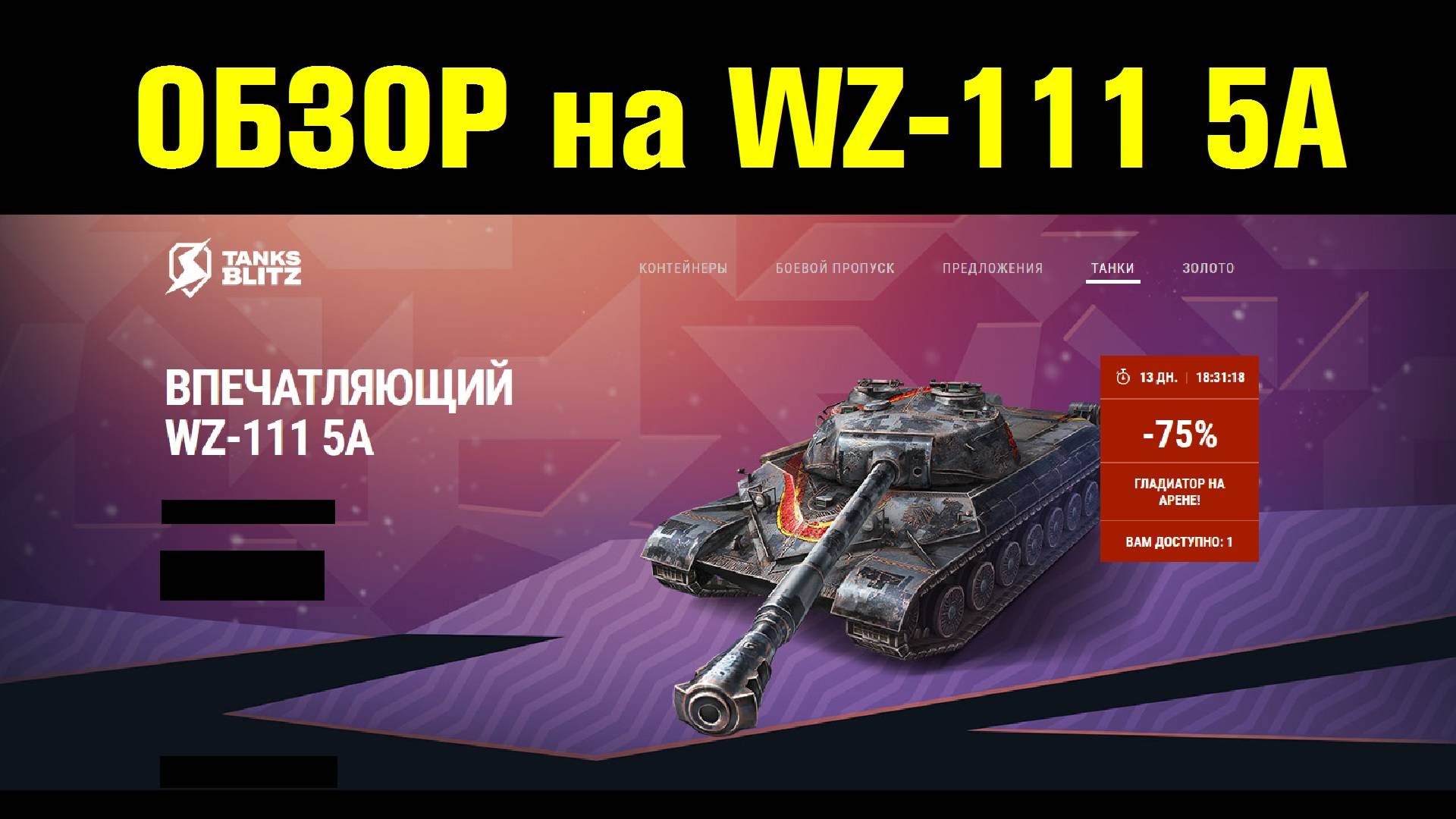 В этом видео я рассказываю о танке WZ-111 5A, который появился в продаже за золото и реальный прайс в игре Tanks Blitz. TanksBlitz Обзоры танков (плейлист): https://rutube.ru/plst/445862/ Мой канал ВКонтакте: https://vk.com/oneshot_play1 Мой канал на YouTube: https://www.youtube.com/@OneShot_Play Мой второй канал по играм: https://rutube.ru/channel/41302499 Ставьте лайки, рассказывайте друзьям и обязательно комментируйте! =)