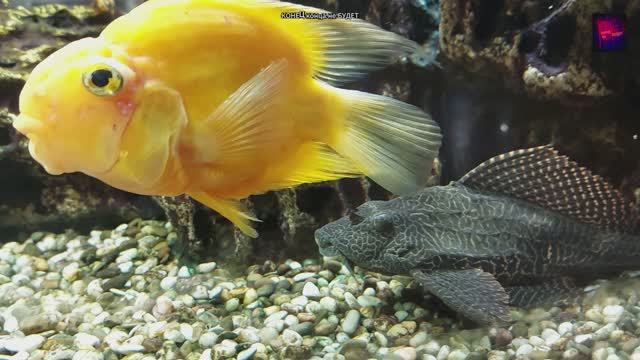 Огромные золотые рыбки и серый пятнистый сом в аквариуме.