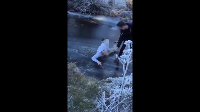 Мужик подскользнулся и провалился под лёд вместе со своим приятелем.