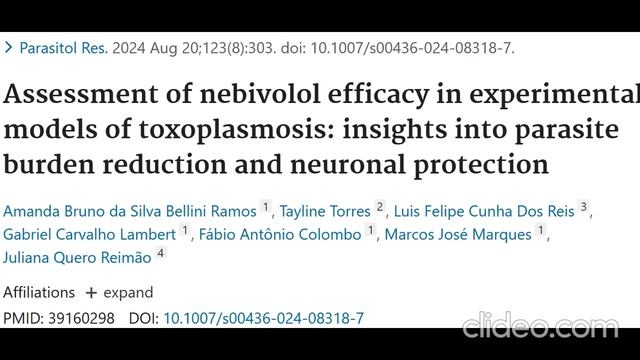 Parasitol Res. 2024 Aug 20;123(8):303. doi: 10.1007/s00436-024-08318-7. Assessment of nebivolol efficacy in experimental models of toxoplasmosis: insights into parasite burden reduction and neuronal protection Amanda Bruno da Silva Bellini Ramos 1, Tayline Torres 2, Luis Felipe Cunha Dos Reis 3, Gabriel Carvalho Lambert 1, Fábio Antônio Colombo 1, Marcos José Marques 1, Juliana Quero Reimão 4 Affiliations Expand PMID: 39160298 DOI: 10.1007/s00436-024-08318-7 https://pubmed.ncbi.nlm.nih.gov/39160298/