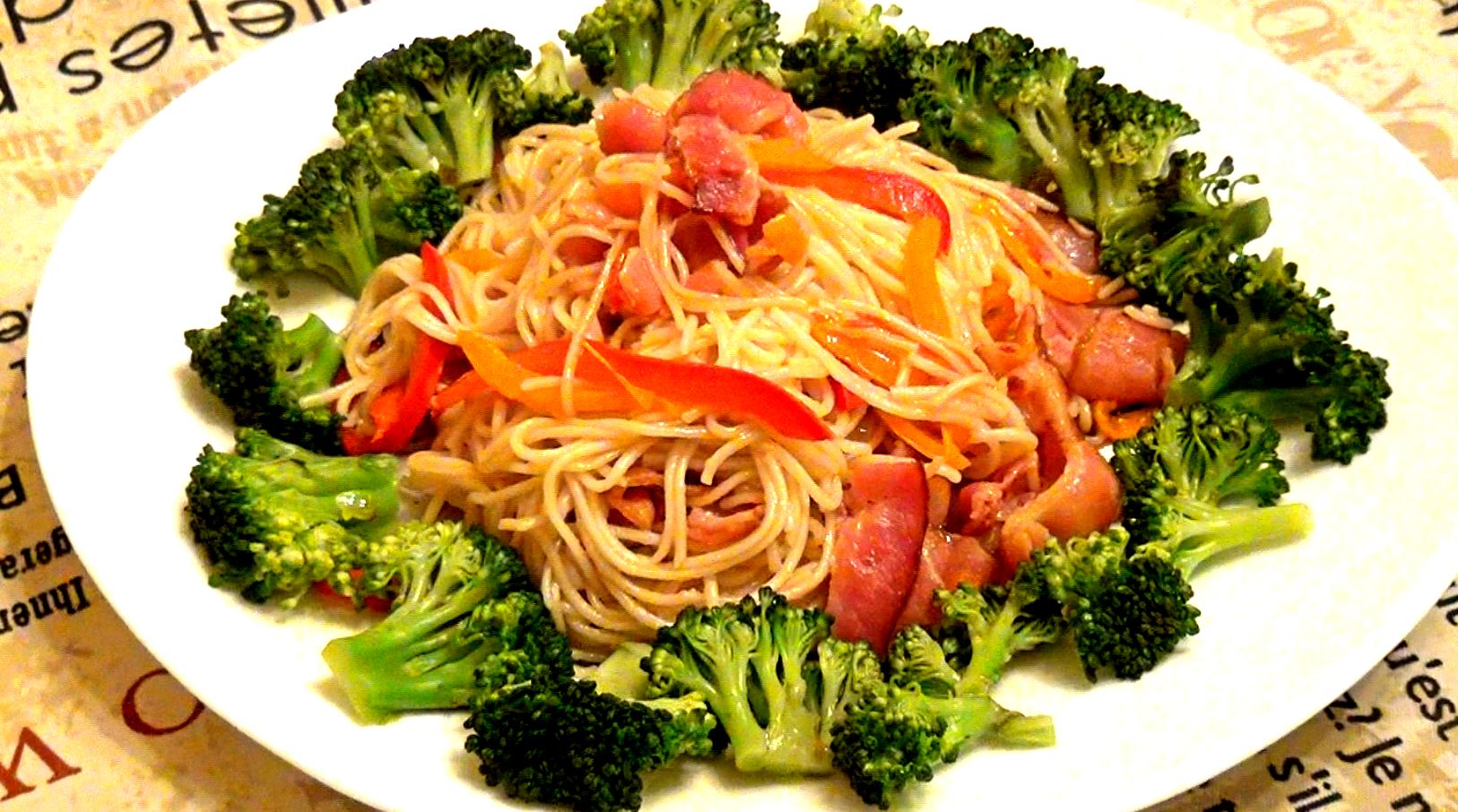 В нашей семье дети обожают макароны. Совершенно в любом виде, будь то итальянская паста карбонара, жареная лапша по-китайски или просто спагетти с сыром. Поэтому мы с мужем периодически экспериментируем, изобретая новые блюда. Этот рецепт лапши - как раз плод одного из таких экспериментов, в котором, на мой взгляд, пересекаются китайская и итальянская кухня. На этот раз у нас получилась паста с овощами и беконом - вкусное, богатое витаминами, сытное и при этом достаточно легкое блюдо. Ищете, как вкусно приготовить лапшу? Тогда смотрите мой видеорецепт!