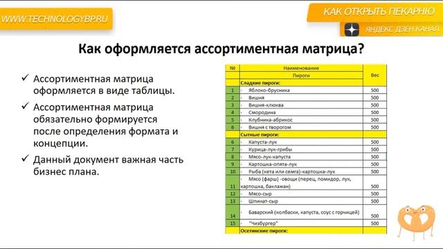 Консультации: https://t.me/denismashkovv или +7 999 962 28 06 ✅Открыть предприятие: https://technologybp.ru Купить ткань для расстойки теста в розницу: https://vk.cc/csMIiV ТГ Канал КАК ОТКРЫТЬ ПЕКАРНЮ: https://t.me/open_bakery Как открыть пекарню с нуля. Что такое ассортиментная матрица. 00:00 Что такое ассортиментная матрица • Видео начинается с объяснения, что ассортиментная матрица - это таблица со структурированным списком ассортиментных позиций, включающая технические характеристики изделий. • Она составляется перед открытием предприятия после формирования концепции. 00:55 Оформление ассортиментной матрицы • Документ оформляется в виде таблицы Excel и включает технологические карты, калькуляционные карты и ценообразование. • В ассортиментной матрице также указываются наименования изделий, их технические характеристики, состав, себестоимость и ценообразование. 02:47 Функции ассортиментной матрицы • Ассортиментная матрица помогает понять, как и что будет производиться на основе концепции предприятия. • Она также определяет необходимое технологическое оборудование, инвентарь и упаковку для изделий. • Структурированный список ассортиментных позиций помогает оптимизировать ассортимент и исключить неэффективные позиции.