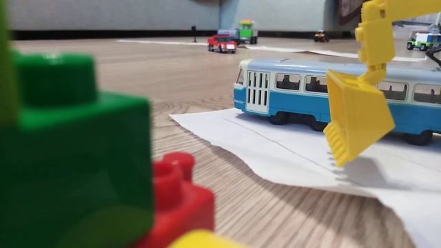 трамвай толкнул экскаватор. камера с машины.