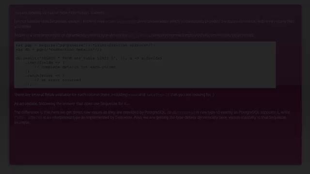 javascript: In a Nodejs Sequelize model, how to obtain type information of attributes? Thanks for taking the time to learn more. In this video I'll go through your question, provide various answers & hopefully this will lead to your solution! Remember to always stay just a little bit crazy like me, and get through to the end resolution. Don't forget at any stage just hit pause on the video if the question & answers are going too fast. Content (except music & images) licensed under CC BY-SA meta.stackexchange.com/help/licensing Just wanted to thank those users featured in this video: user3139868 (https://stackoverflow.com/users/3139868/user3139868 vitaly-t (https://stackoverflow.com/users/1102051/vitaly-t) Being Spectator (https://stackoverflow.com/users/9350032/being-spectator) Trademarks are property of their respective owners. Disclaimer: All information is provided "AS IS" without warranty of any kind. You are responsible for your own actions. Please contact me if anything is amiss. I hope you have a wonderful day. Related to: javascript, node.js, postgresql, sequelize.js